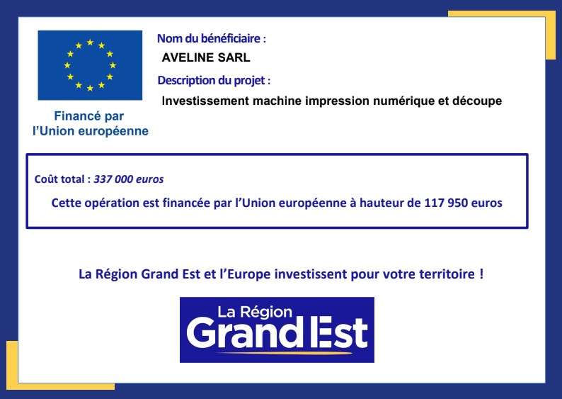 En 2025, l’entreprise Aveline renforce son développement avec l’acquisition d’une machine d’impression numérique et de découpe de dernière génération. Cet investissement permet de gagner en réactivité et en précision pour mieux répondre aux besoins des clients.